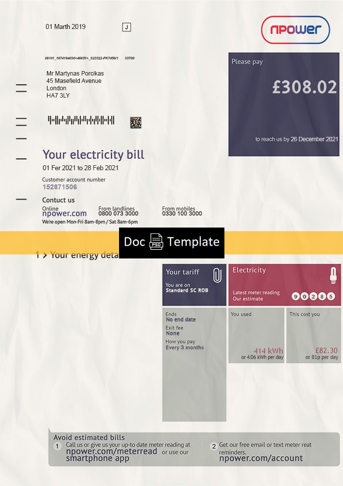 Npower Utility Bill mockup PSD is a fully editable photoshop template that is easy to customize. With high quality and layer based, this mockup is perfect for those who want to put any name, address, number, expire date, etc. on their utility bill.